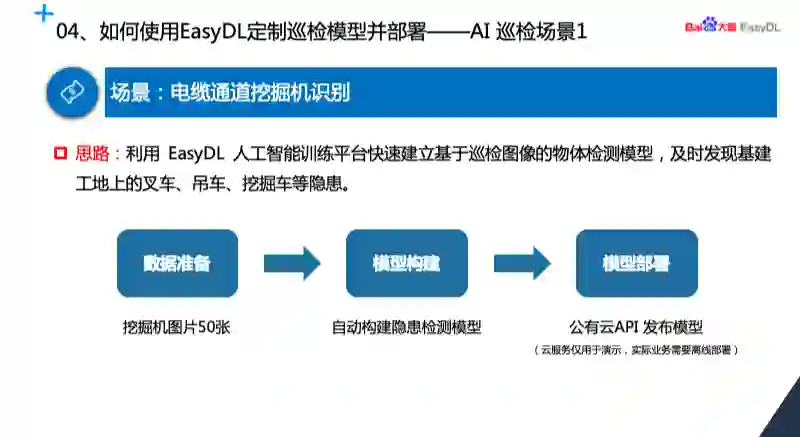 整个场景的思路是利用 EasyDL 人工智能训练平台建立基于巡检图像的物体检测模型,及时发现电缆通道上长期停留的叉车、吊车和挖掘机等隐患。识别过程首先是做数据的准备,我们在互联网上寻找了 50 张左右挖掘机照片,然后在 EasyDL 上构建模型,最后训练之后在公有云 API 上发布,等一下我会展示简单的部署情况。