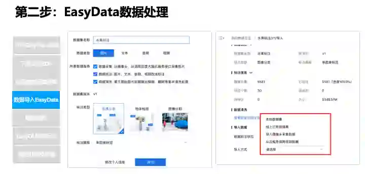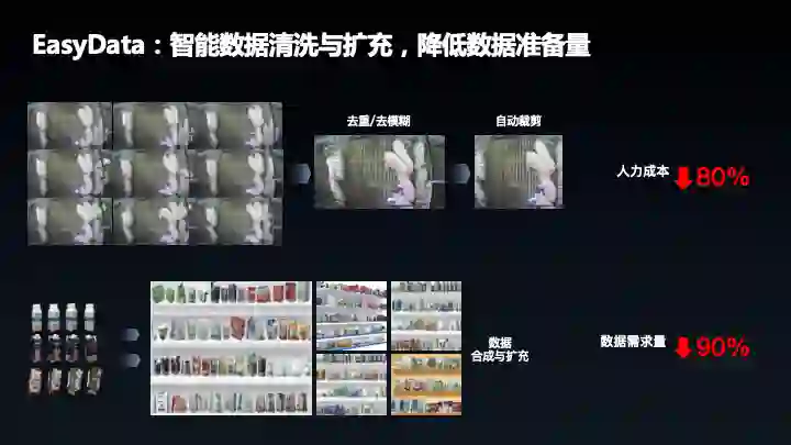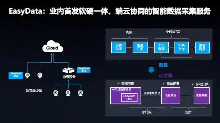 在实际生产数据环节,EasyData 帮用户做了线下很多琐碎的工作,如硬件选型和调试,EasyData 推出软硬一体方案,在 EasyData 下载软件,安装即可使用,数据清洗环节,后续会推出对应的功能。智能标注,目前已经提供了单人在线标注和多人标注,后续会上线多人智能标注,EasyData 让 AI 更简单,更专业。