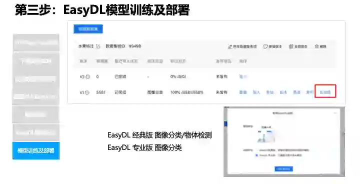 第三步就是数据的标准和上传,考虑到数据的可持续应用,采用了本地标注,通过接口批量接口上传到 EasyDL,EasyDL 也提供了在线标注,标注的数据存在百度大脑这边,本地就没有。第四就是模型训练,我们采用了经典版和专业版进行了物体检测训练,经典版比较容易操作,适用于小白,不懂算法的,经过一天的学习可以很方便的使用。