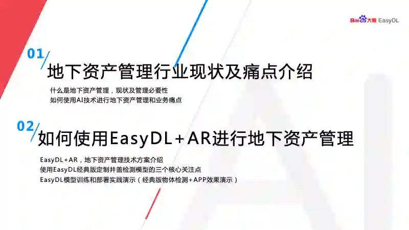 主要分两个方面进行介绍,第一是地下资产管理的现状以及痛点介绍。第二是如何使用 EasyDL+AR 进行地下资产管理。