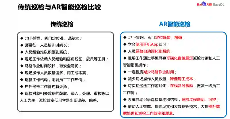这款产品与传统的巡检进行了比较,从以下几个方面。传统的巡检地下管网和阀门定位难、误差大,利用 EasyDL 智能巡检,地下管网和阀门定位简便而且准确。第二就是存在着师傅带徒弟,人员培训时间长,我们的产品只要学会手机的 APP 使用即可,门槛非常低,即使是刚入职的员工也可以经过一个礼拜左右的培训,就可以完成培训任务。