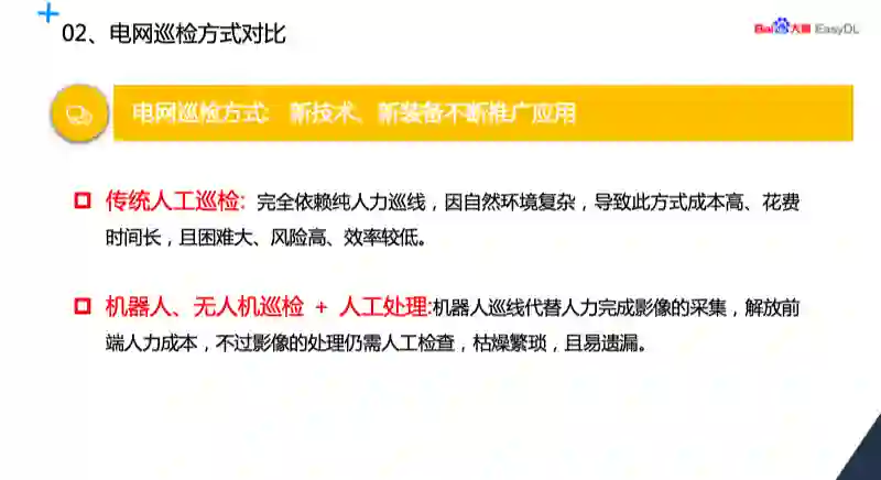 首先理念上我们将 AI 技术与传统的巡检业务结合,能够将 AI 赋能传统电网巡检,提升产业动能。第二方面,是技术上有创新,我们将 AI 技术不断引入算法框架以及目标识别框架进行故障判断,能够大幅度提升判断的准确率。第三块变化就是模式的创新,通过不断的落地实施,通过数据、样本和模型库的积累,能够形成一个有效的数据资产的共享。