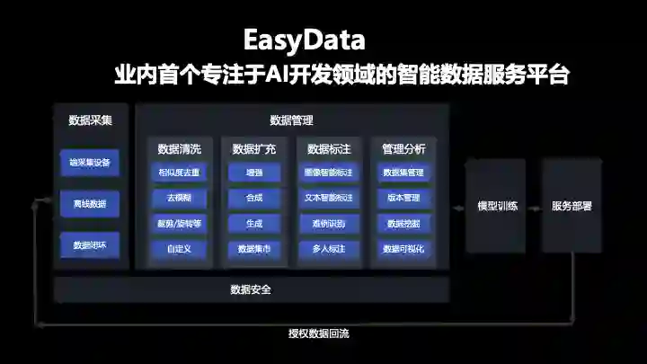 这是 EasyData 的整体业务架构图,在数据采集、数据扩充、数据清洗、数据标注、数据管理分析等数据生产过程中做了比较专业规范的工作,而且会在这些方向上持续提供能够给用户解决实际问题的功能。
