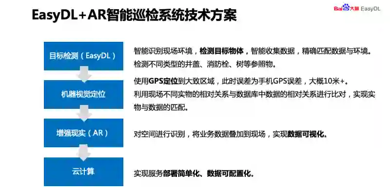 介绍一下 EasyDL 智慧阀门巡检系统。AR 智慧阀门巡检系统是以智能手机为载体、运用最新 IT 技术,实现阀门巡检工作从信息化到智能化飞跃的一款最新的运用软件。