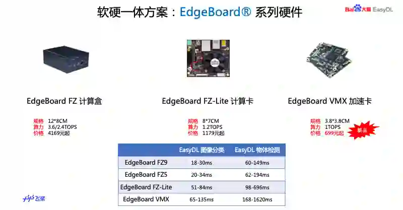再接下来讲一下软硬一体方案,通过把高性能的计算设备和深度适配过的设备端 SDK 相结合,方便大家选型时候集成到自己的生产环境。EdgeBoard 是百度自研产品,前面预告片提到,包括计算盒和计算卡、加速卡,有的可以直接步入,有的可以嵌入到系统,作为加速卡做嵌入式使用,这些大家可以在百度 AI 市场可以买到。