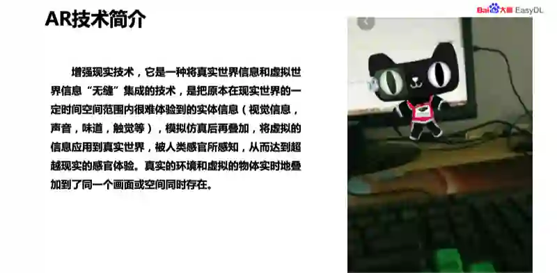 下面简单介绍一下 AR 的技术,经常玩游戏的人对 AR 多少有一些了解,有一款游戏是口袋妖怪,也是通过AR抓妖怪的。增强现实的技术主要是把虚拟的信息叠加到现实世界当中,使人能够感知到虚拟物体,真实的环境和虚拟物体实时叠加到同一个画面,在空间当中同时存在。