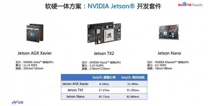 另外是新推出的 NVIDIA Jetson,目前正在陆续在 AI 市场商家,从 Nano,TX2,到 Xavier,满足不同型号的要求,物体检测模型可以在百毫秒以内完成。