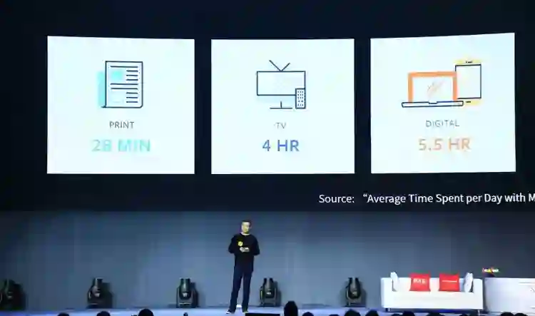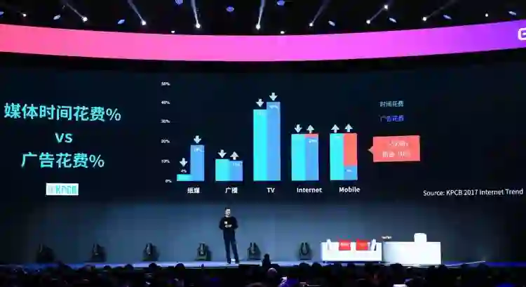 那这样的趋势意味着什么?其实广告主永远都是跟着用户走的,在最开始的时候,广告主都是在纸媒和广告上面,随着电视的普及以及它作为一个更有力的媒体,它就变成了广告主的宠儿,现在的用户都在哪?所以我认为,这样的一幅图告诉我们,如今还花在一些传统媒体上的钱,会随着这个不可逆的趋势转到移动上,之所以这样的趋势还没有完全发生,广告业相对来说是一个比较传统的行业,广告主需要时间做变革,同时也需要像 Facebook 和 Google 这样的企业做产品的迭代,来推进这样的趋势的变化。