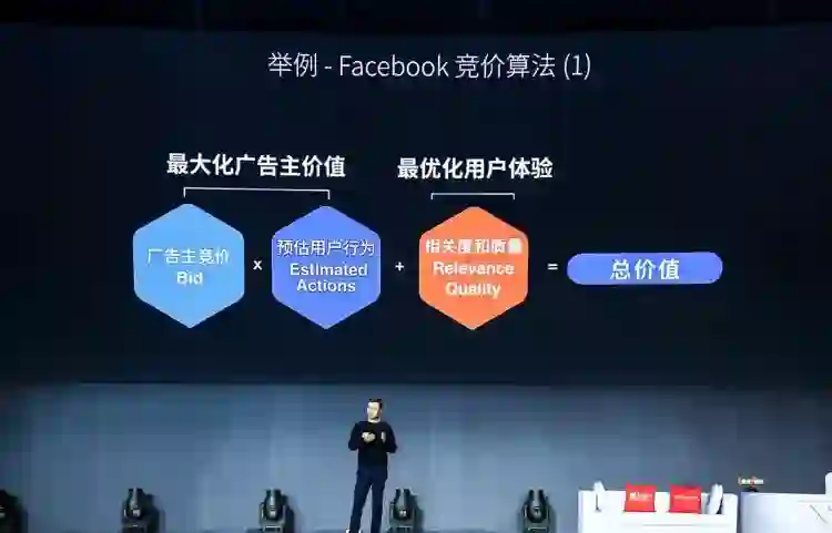 我为大家举个例子,Facebook 最核心的广告竞价算法,每一个广告在我们平台上面,都会根据这个算法来做出估值,也就是说我们认为这个广告的总体价值是多少。