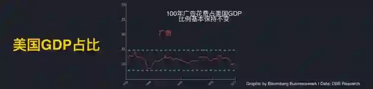 这幅图表明的是广告占美国 GDP 在过去 100 年的比例,基本不变,在 1%—2% 之间浮动,看来因为广告是连接用户和商品的重要桥梁,它对广告和商家来说都是非常重要的,过去一百年是这样,未来一百年我相信还是这样。
