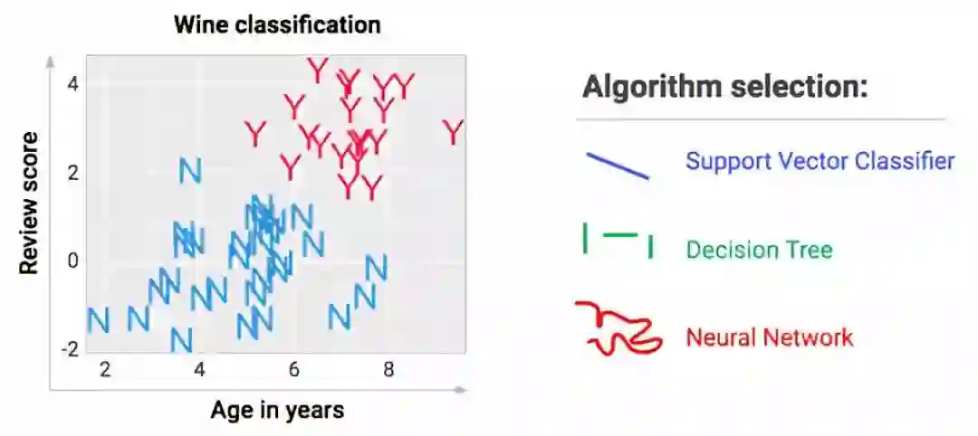 一旦你将刚出炉的模型投入使用,在向计算机输入酒龄,评级分数后,你的系统就会查找这瓶红酒数据对应的区域,并输出一个标签。