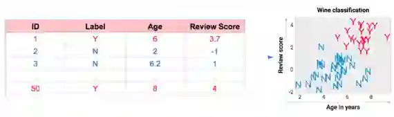 想象我们品尝了50种葡萄酒,并且为了方便展示,我在下面进行了数据可视化。每款酒的数据包括年份、分数,再加上我们想学的特征:Y代表好喝,N代表不好喝。