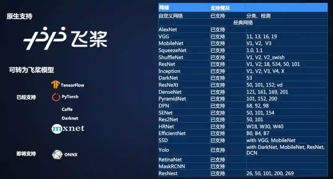 如图,EasyEdge支持主流的深度学习框架、部分网络,后续大家可以在EasyDL官网上了解更多信息。