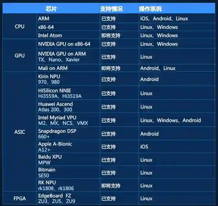 EasyDL-EasyEdge已支持10余类芯片、4大操作系统: