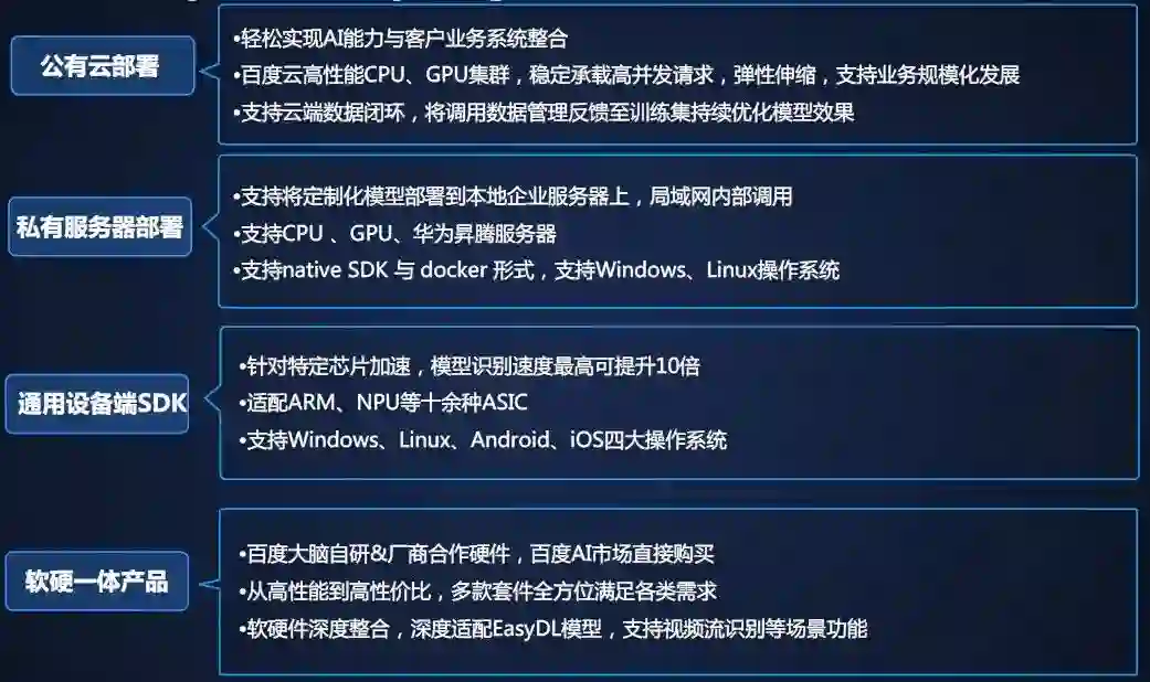 EasyDL-EasyEdge也提供丰富的服务部署形态,包含公有云部署、私有服务器部署、通用设备端SDK、软硬一体产品等,端云协同即将上线: