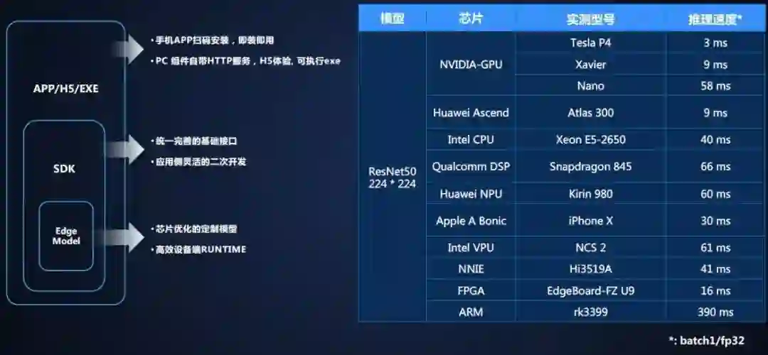 上图是ResNet50深度学习模型部署在不同的芯片上得到的单次推理时间,芯片架构层面可以做更广泛的适配,同时也为用户选型提供参考。