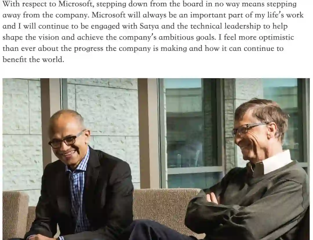 在比尔·盖茨 Linkedin 上的这封“辞职信”中,他放了一张跟萨蒂亚·纳德拉的照片,并表示:微软永远是我一生的重要工作,我将继续与萨蒂亚和技术领导者保持联系,帮助塑造愿景并实现公司宏伟目标。