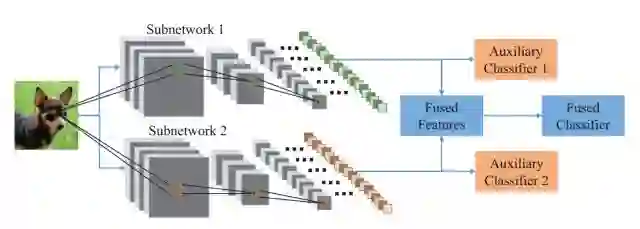 图1. DualNet的整体框架。图像输入两个相互协调学习互补特征的子网络。然后,两个流特征被融合为一个通用的表达,并被传入融合分类器(Fused Classifier)来进行总体分类。增加的辅助分类器用来保持两个网络独立学习的特征的区分性。
