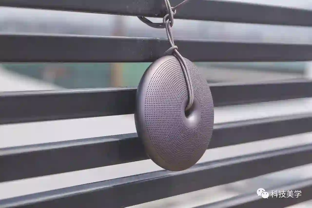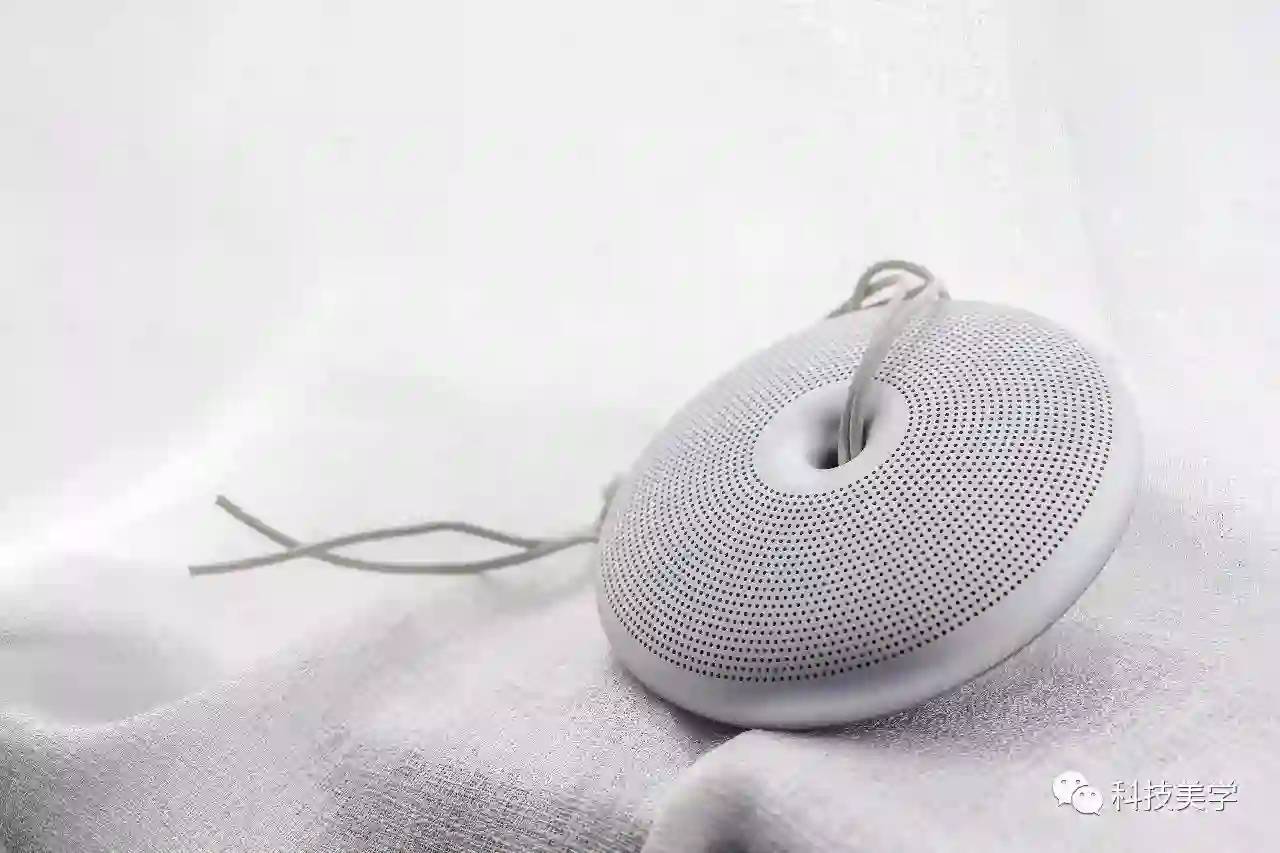 网易云音乐蓝牙音箱的圆盘中间还有一个圆孔,配合做旧的头层真牛皮挂绳可以将音箱挂在任何地方,这种设计已经跳出「功能性」之外,变成一个提升格调的部件。