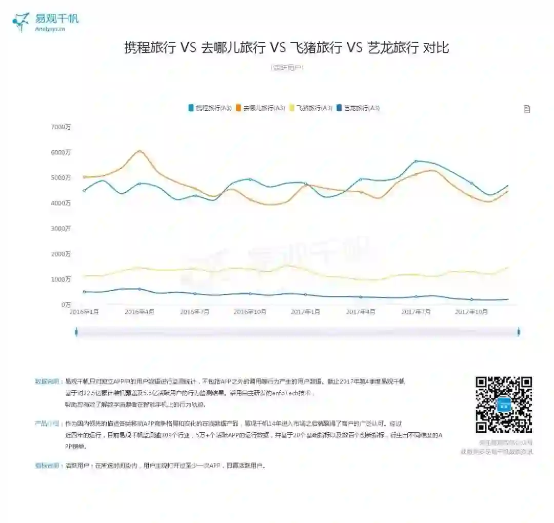 不断向好的趋势下,过去的2017年仍有许多插曲。业务发展方面,携程机票搭售风波为在线厂商敲了警钟。这反映出了厂商在经历流量争夺的第一阶段后开始追逐利润的过程中,在快速发展时期遗留下的产品与服务缺陷开始显露。但这并不成为影响业务和商业发展的颠覆性事件。这是用户倒逼厂商增强服务的必经过程。从易观监测数据来看,携程系的月活跃用户也并未受到巨大影响。