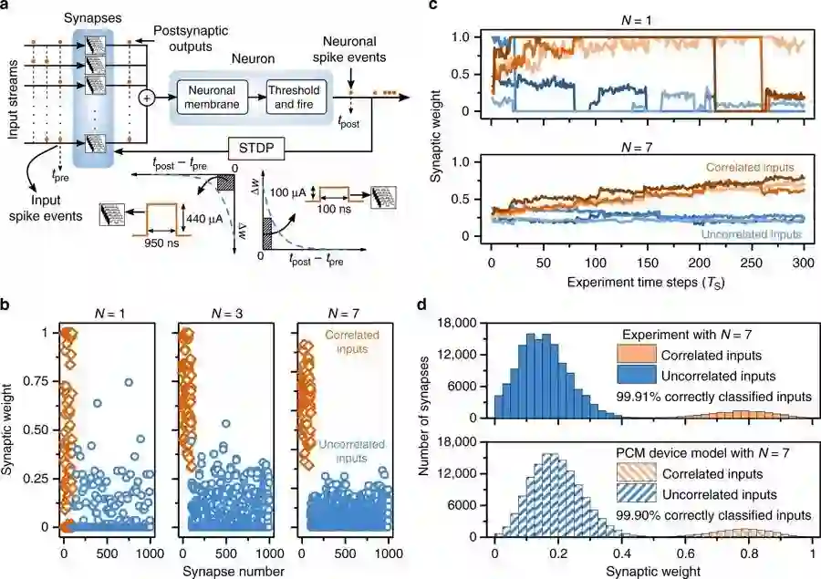 b.在实验结束时,显示了由N = 1、3和7个PCM设备组成的突触权重。可以看出,接受相关输入的突触的权重往往大于接受不相关输入的突触的权重。随着N的增加,权重分布更加清晰。