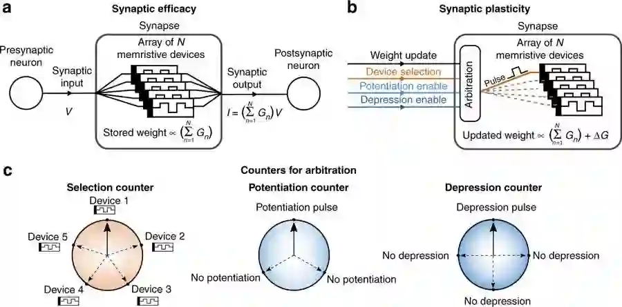 a.一个多记忆突触的突触净权重(net synaptic weight)是由多记忆设备(multiple memristive devices)电导累加和()表示。为了实现突触效能(synaptic efficacy),所有设备都使用电压读取信号(read voltage signal),V。通过每个设备产生的电流被汇总起来,由此产生突触输出(synaptic output)。