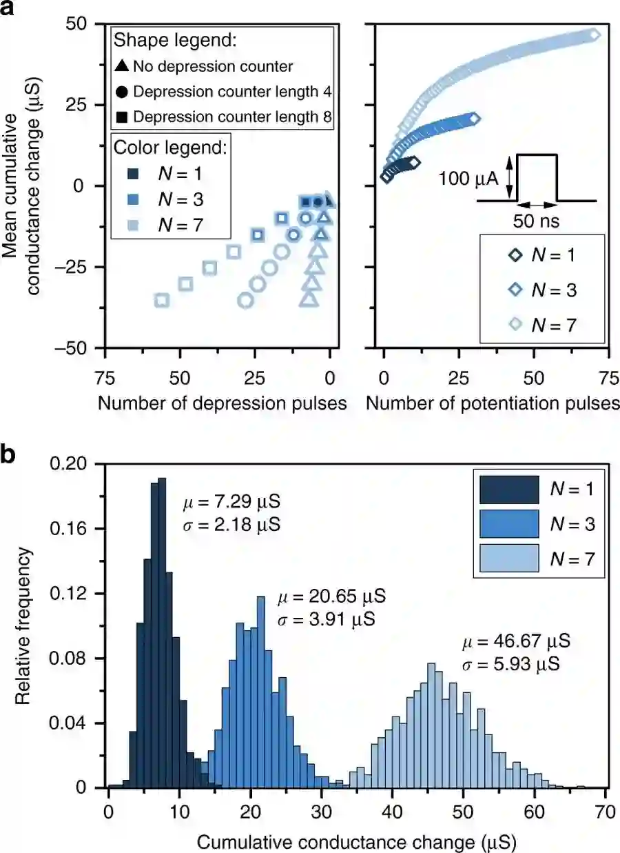 a.对第1、3和7PCM设备进行实验,得到突触的平均累积电导变化。测量是基于1000个突触,每个设备的电导都初始化为~5μS。对于增强实验,脉冲值选择=100μA,而衰弱实验中,脉冲值选择=450μA。