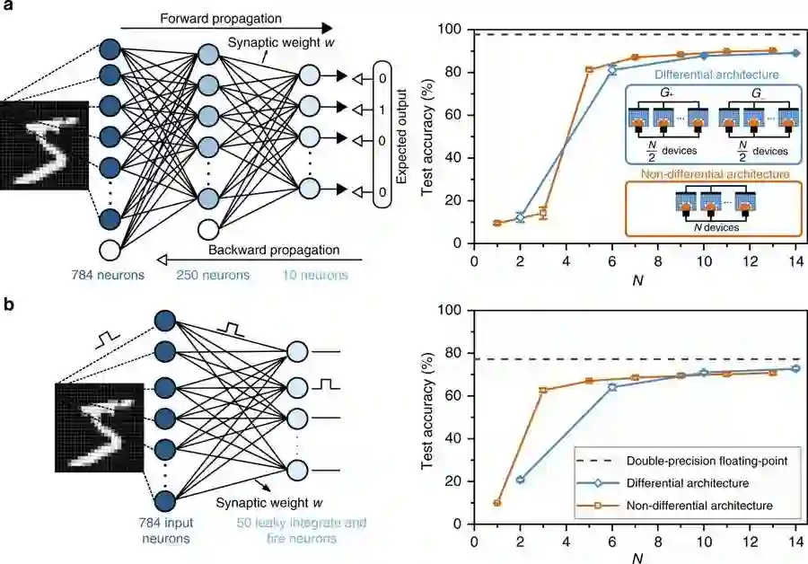 a.利用反向传播训练人工神经网络进行手写数字分类。在输入层和隐藏层中使用偏置神经元(bias neurons)(白色)。利用PCM器件的非线性电导响应,建立了一种多模态突触模型,用于表征这些模拟中的突触权重。增加多记忆突触装置的数量(包括有差别结构和无差别结构)可以提高测试的准确性。对五种不同的初始化权重进行了重复模拟。误差条(error bars)表示标准偏差。虚线显示了在双精度浮点软件上实验得到的测试精度。
