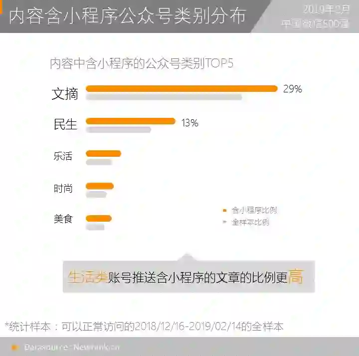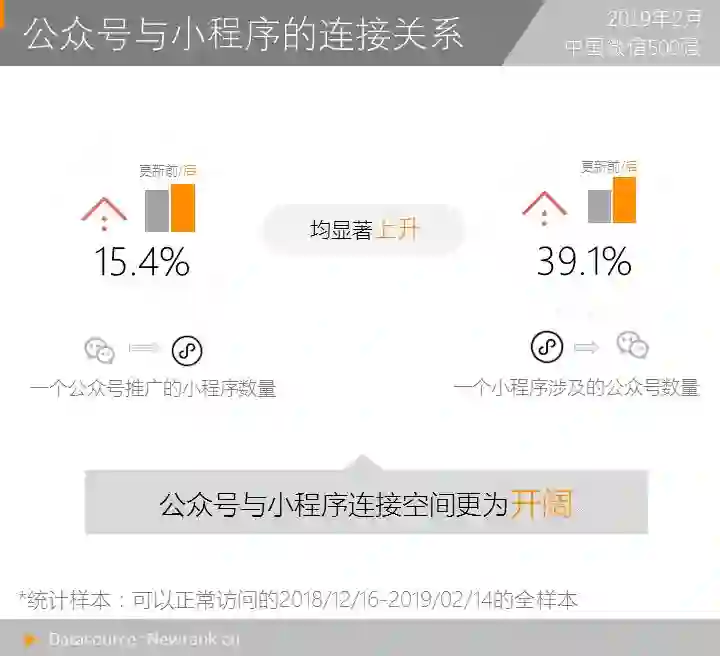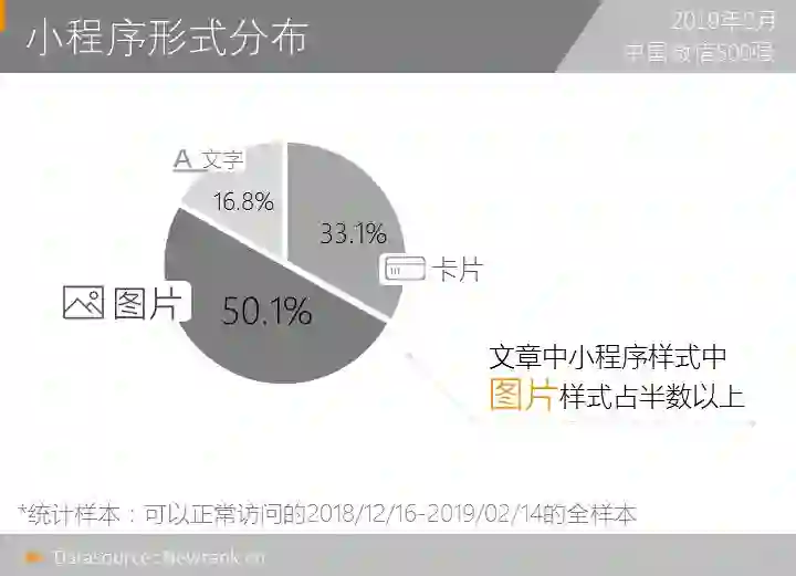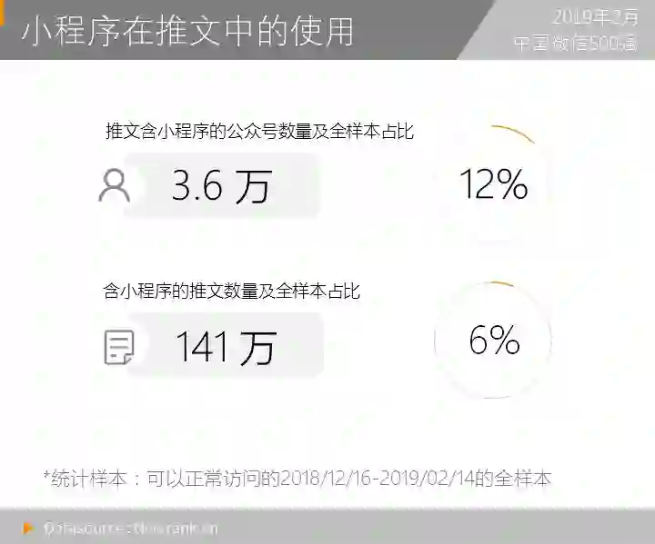 新榜选取从2018/12/26至2019/2/14(更改规则前后各取30天)全样本中含小程序的推文内容作为研究样本,试图探究小程序在公众号推文中的使用现状及新规则带来的变化。