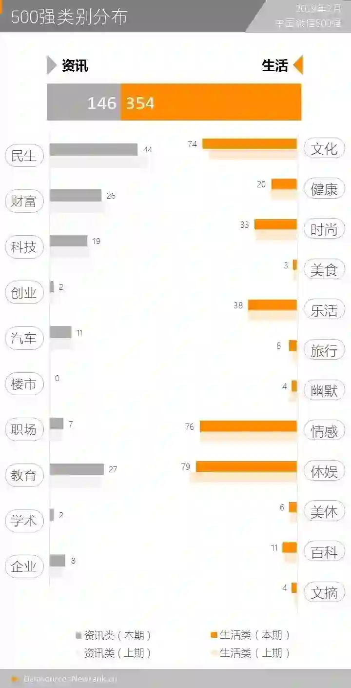 体娱(79)、情感(76)、文化(74)、民生(44)、乐活(38)是2月500强中所占席位最多的类别位次。上述五强类别占据500强席位的62%。文化类增加5席至74,体娱及民生类账号席位各缩减5席,其余类别席位基本维持稳定。