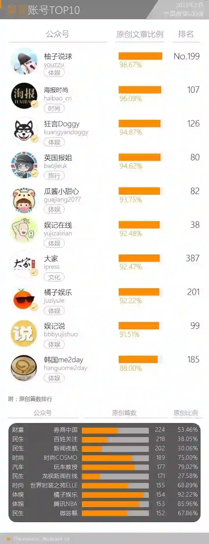 本月原创十强门槛为88%,较1月提高3.8个百分点;十强中体娱类公众号居多,占7席。