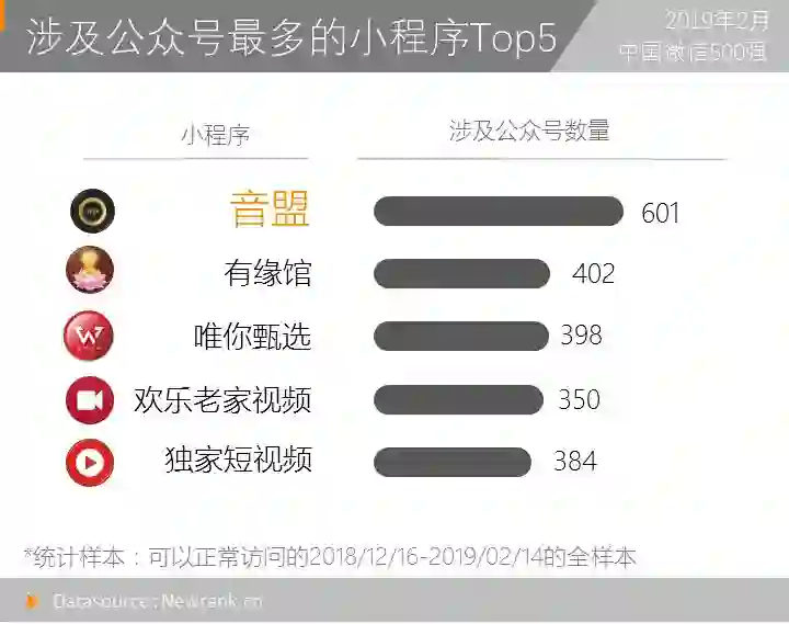 统计观测样本中小程序在推文中所涉及的公众号数量发现,Top5中,「音盟」、「欢乐老家视频」、「独家短视频」均为短视频类小程序。进一步观察涉及量最大的小程序「音盟」,共涉及601个公众号,覆盖新榜16个公众号分类,这些公众号中,有287个账号由178个不同的企业认证主体开发,可见其运营规模之庞大。以小程序作为短视频内容的载体,再利用公众号作为传播媒介延伸触角,短视频小程序利用微信的社交环境实现传播裂变的想象空间还很大,或已掀起另一波浪潮。