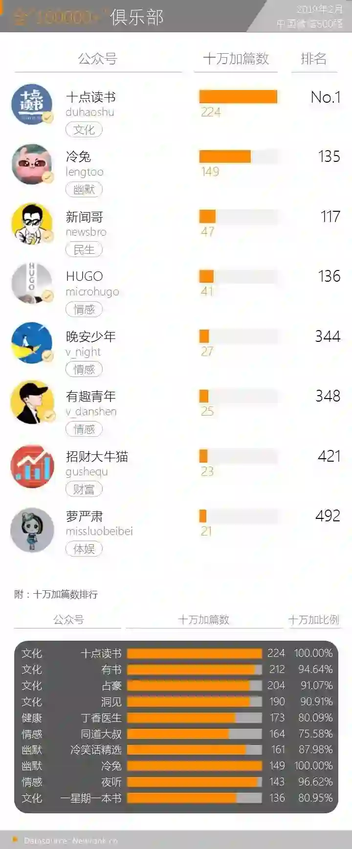 「十点读书」每日推送,每次推送8篇,总计224篇,凭借全十万加阅读内容位居榜首,前三甲均为文化类账号。