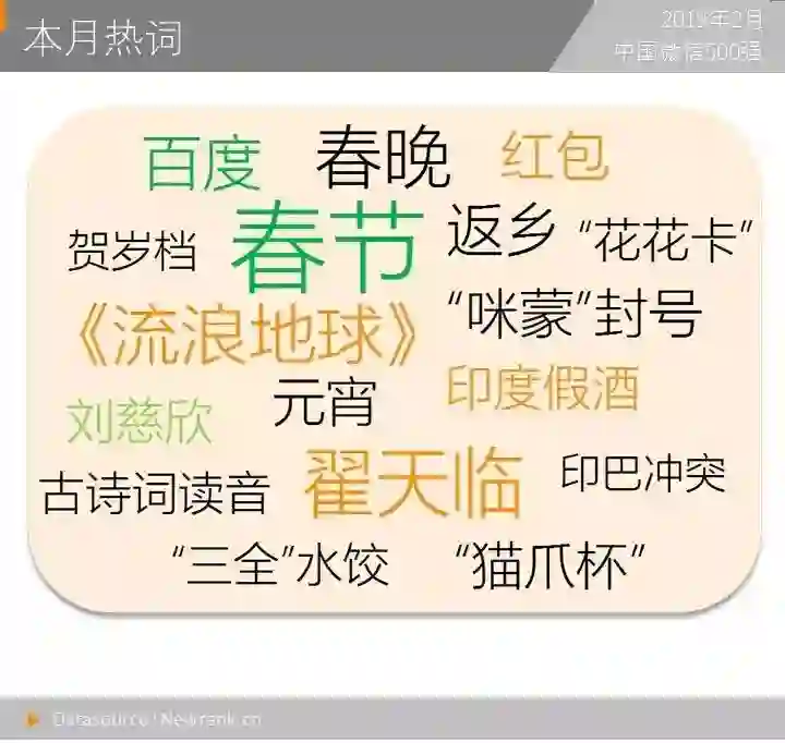 除去春节、元宵传统节日以及返乡见闻,2月全民津津乐道的话题层出不穷:春晚红包史首次未宕机,百度技术获各方点赞;《流浪地球》震撼热映口碑燃爆全球;咪蒙“封号事件”引发新媒体圈讨论;“翟天临学术门”持续发酵热议不断;此外,“三全”水饺被曝检出非洲猪瘟病毒、印巴冲突持续升级、印度假酒事件、星巴克猫爪杯风波同样受到高度关注。