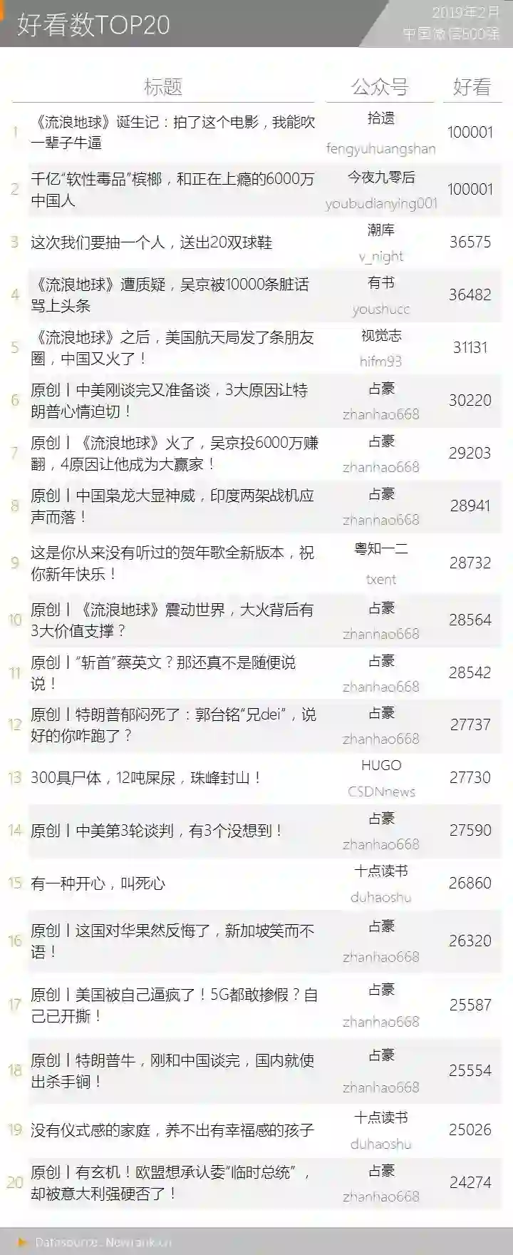 在本月好看数TOP20内容中,「占豪」收获11篇,为内容上榜数量最多的公众号。