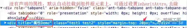 这是2.4.0 新增的一个API,默认情况下父作用域的不被认作 props 的特性绑定将会“回退”且作为普通的 HTML 特性应用在子组件的根元素上。可通过设置 inheritAttrs 为 false,这些默认行为将会被去掉。注意:这个选项不影响 class 和 style 绑定。 上个例中,title属性没有在子组件中props中声明,就会默认挂在子组件的根元素上,如下图所示: