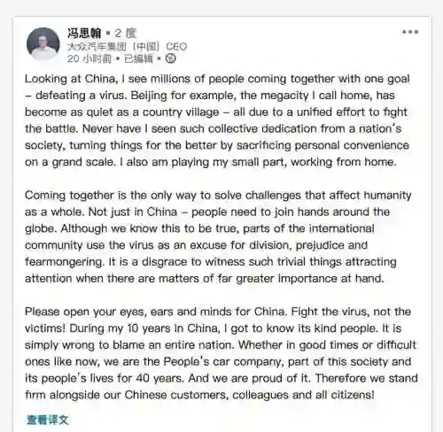 5、大众集团CEO呼吁全球携手抗击病毒,不要制造恐慌