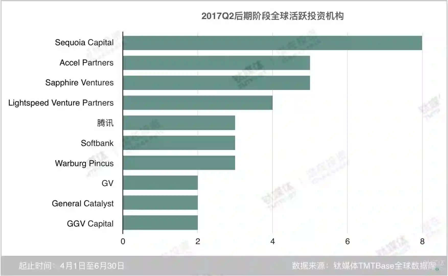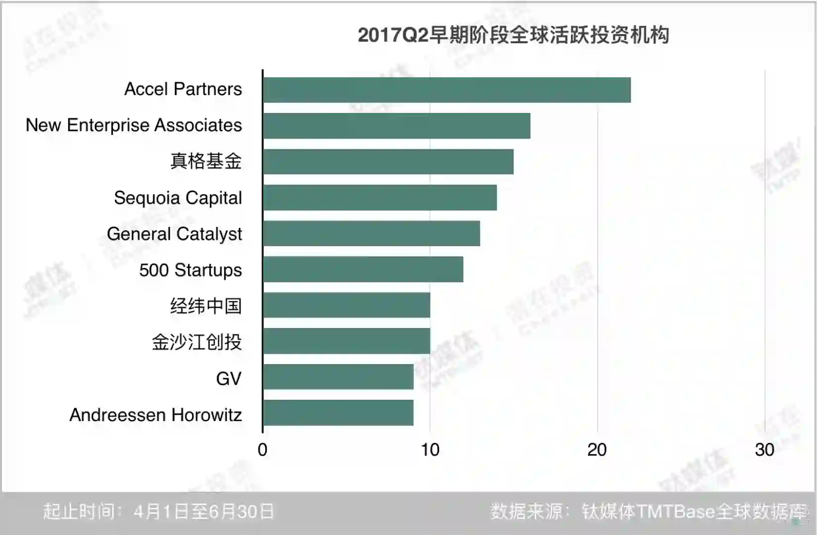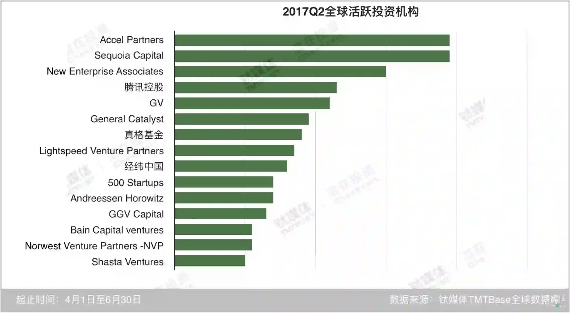 钛媒体TMTBase全球数据库,2017年第二季度共收录1335起全球融资事件,其中国内共735起,国外600起。综合这1335起融资事件,我们以投资机构为分析对象,深入全球风险投资生态系统,梳理出2017年第二季度较为活跃的投资机构,从中探寻2017年市场发展的潜在方向。
