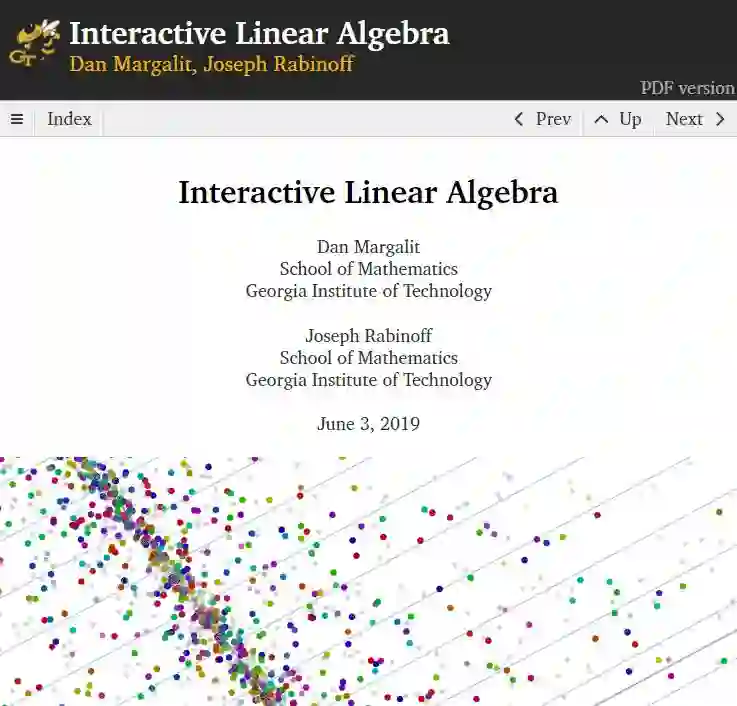 《交互式线性代数》的作者是Dan Margalit 和 Joseph Rabinoff,均来自乔治亚理工学院的数学学院。该书是佐治亚理工Math 1553的配套教材,共有455页,包含了140多个交互demo,可以让读者直观地理解代数背后的几何性质。