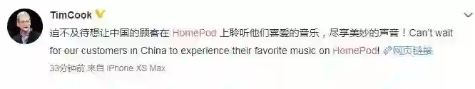 苹果CEO库克也在微博上“安利”了这款产品:“迫不及待想让中国的顾客在 HomePod 上聆听他们喜爱的音乐,尽享美妙的声音!Can’t wait for our customers in China to experience their favorite music on HomePod! ”