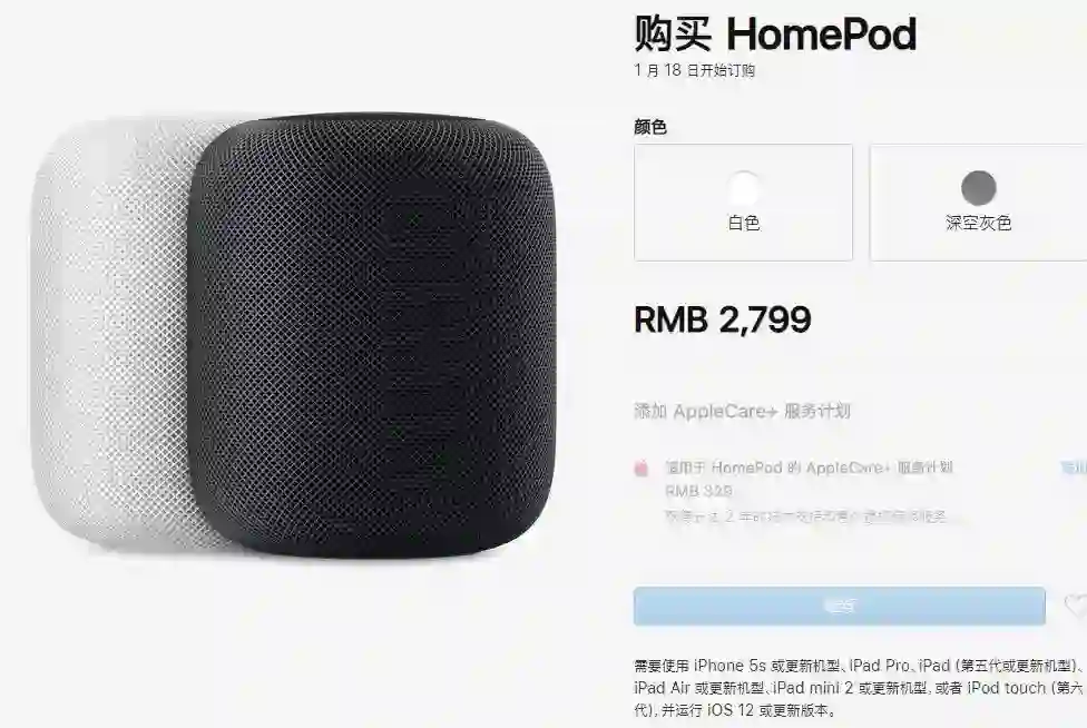 苹果14日在官网宣布,HomePod将于1月18日在中国区开始发售,提供两种颜色选择,白色以及深空灰,售价为2799元。