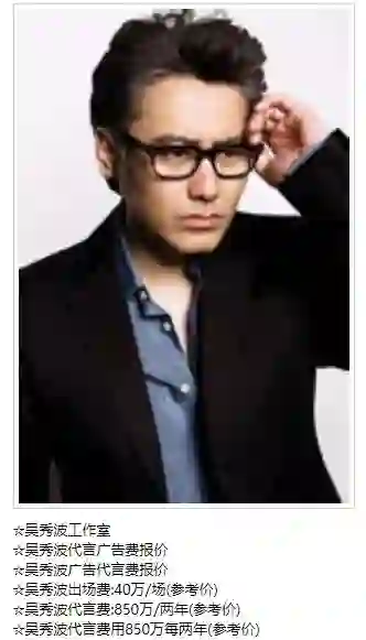 据华仔·明星经纪公司的报价,吴秀波的代言费2年850万。照此计算,上述18个代言产品,吴秀波2年的代言费就过亿。