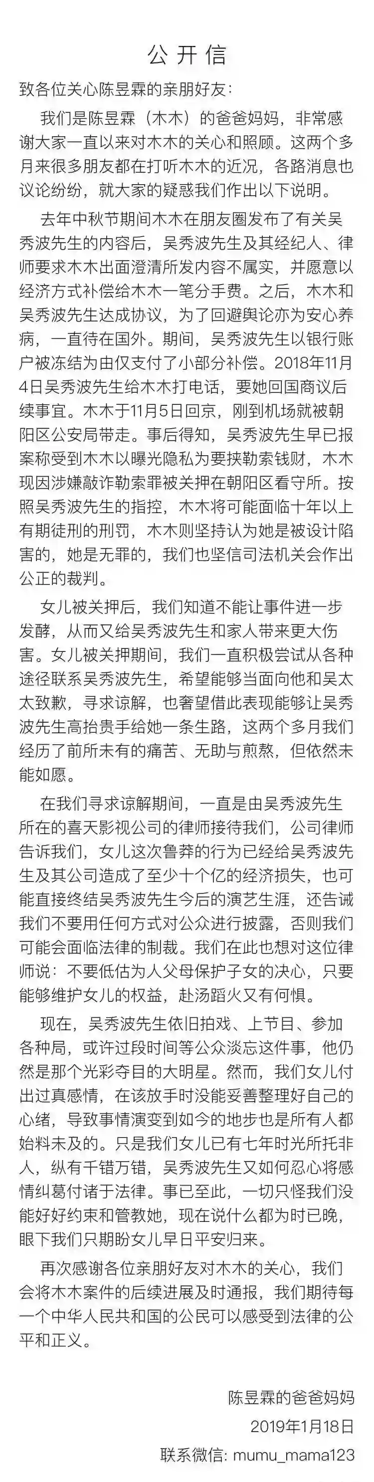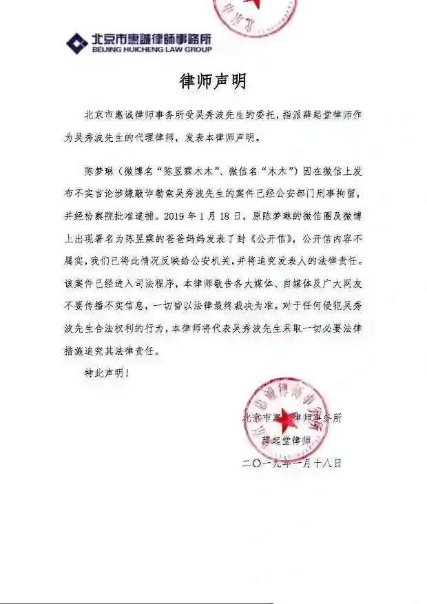 陈梦琳(微博名“陈显霖木木”、微信名“木木”)因在微信上发布不实言论涉嫌敲诈勒索吴秀波先生的案件已经公安部门刑事拘留并经检察院批准逮捕。2019年1月18日,原陈梦琳的微信圈及微博上出现署名为陈显霖的爸爸妈妈发表了封《公开信》,公开信内容不属实,我们已将此情况反映给公安机关,并将追究发表人的法律责任。该案件已经进入司法程序,本律师敬告各大媒体自媒体及广大网友不要传播不实信息,一切皆以法律最终裁决为准对于任何侵犯吴秀波先生合法权利的行为,本律师将代表吴秀波先生采取一切必要法律措施追究其法律责任。