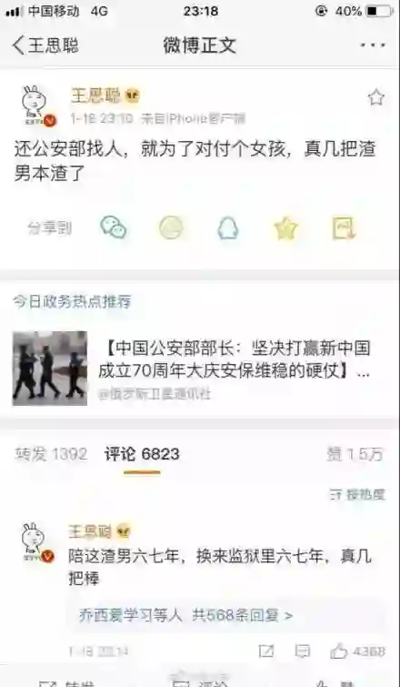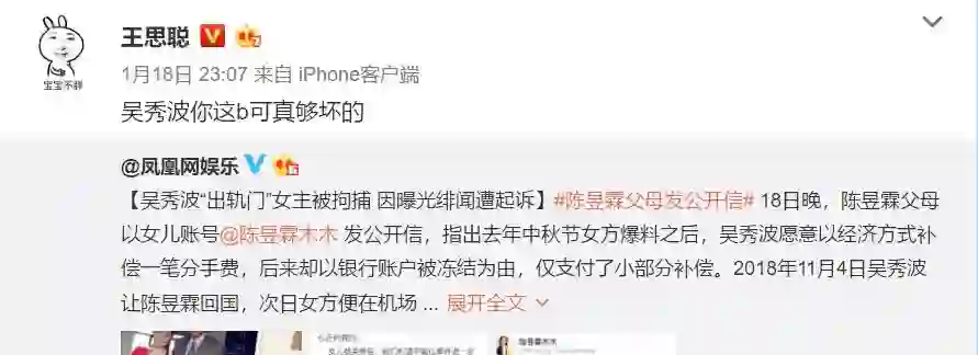 公开信发布后,王思聪发微博评论此事:“还公安部找人,就为了对付个女孩,真是渣男本男了。”王思聪随后还在评论中写到:“陪这渣男六七年,换来监狱里六七年,真棒。”娱纪王思聪的几轮实名DISS后,该娱乐新闻很快上至微博热搜,接下来作为吴秀波的代理律师声明也同时遭到律师界同仁们的热议。
