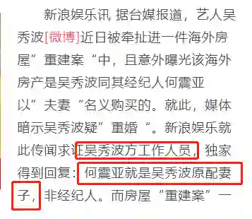 当时吴秀波工作人员公开回复,何震亚就是吴秀波的原配妻子。