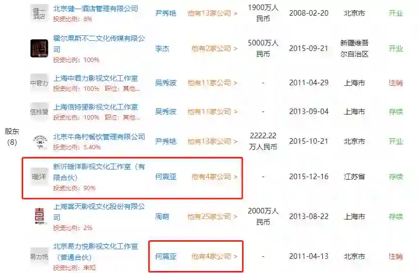 其中包括北京健一酒店管理有限公司、霍尔果斯不二文化传媒有限公司(以下简称“不二文化”)、上海信持望影视文化工作室、北京牛角村餐饮管理有限公司、新沂暖洋影视文化工作室(有限合伙)。