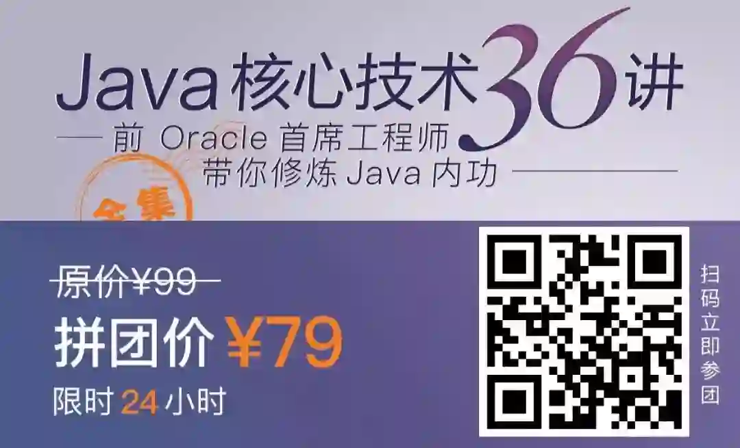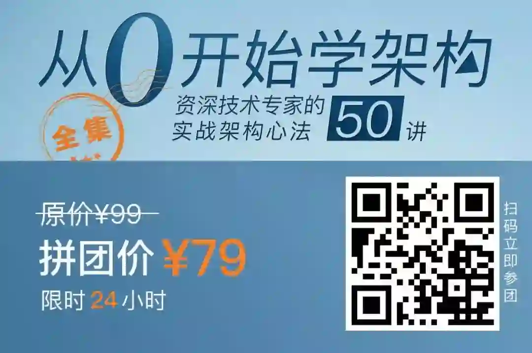 《从 0 开始学架构》和《Java 核心技术 36 讲》这两门硬核专栏,原价都是 99 元,现在参加拼团只需要¥79 元,两顿外卖的钱。