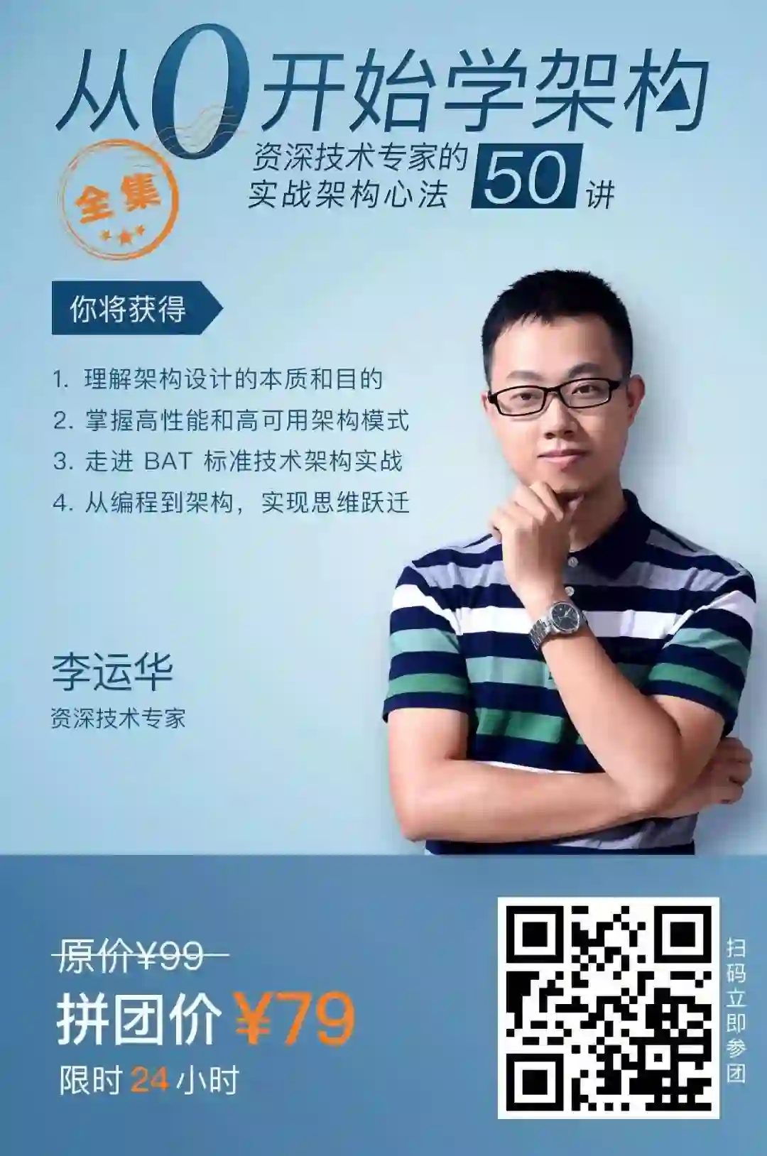 这个专栏,作者李运华,有着十几年架构师经验,他会从架构基础、3 大架构模式和实战的角度,给你分享他独家总结的一整套架构设计方法论。专栏一共 52 讲,光留言互动就超过 20 万字,是市面上最全面、性价比最高的架构课程。