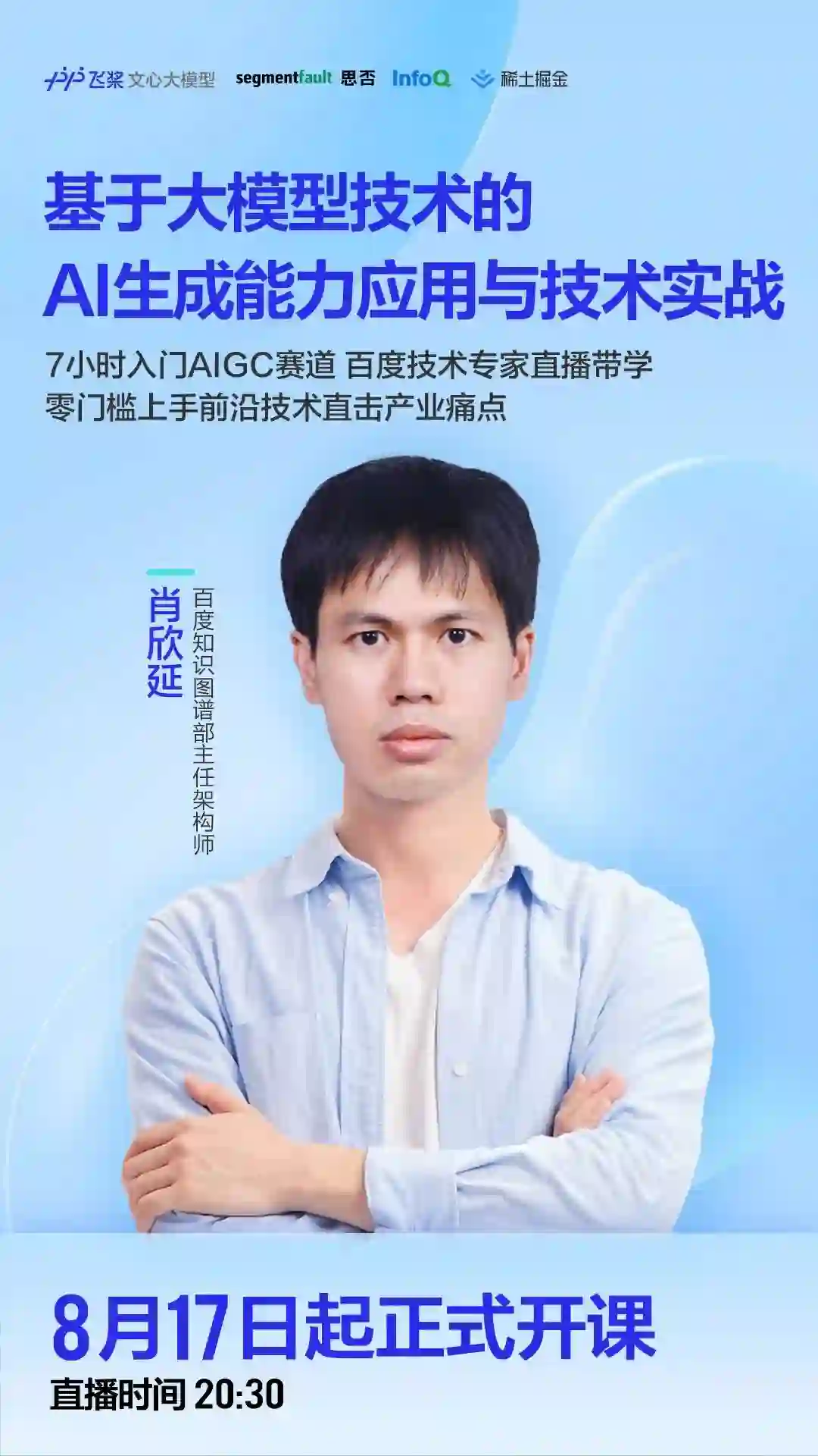 百度主任架构师肖欣延等多位大佬亲授、业内首个基于大模型技术的AIGC专题直播打卡课!8月17日晚正式开课,零基础也能清晰了解、轻松应用基于大模型的AIGC能力应用与技术要点。