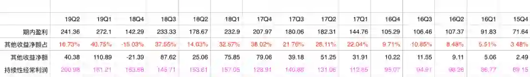 数据很明显显示,投资收益(也即其他收益净额)在18Q4~19Q1,基本处在利润扭曲的巅峰期,当然这也和资本市场大熊市是挂钩的。